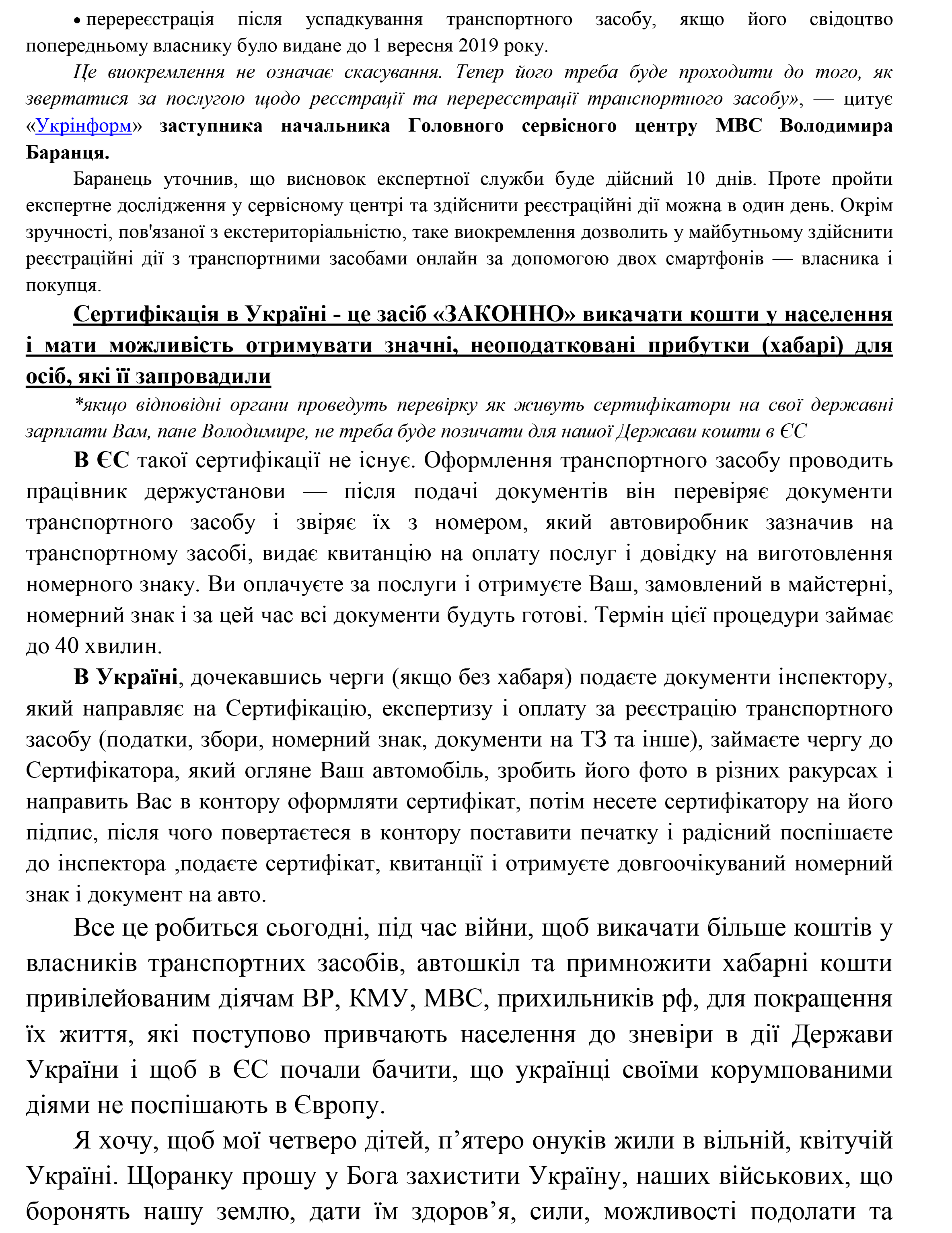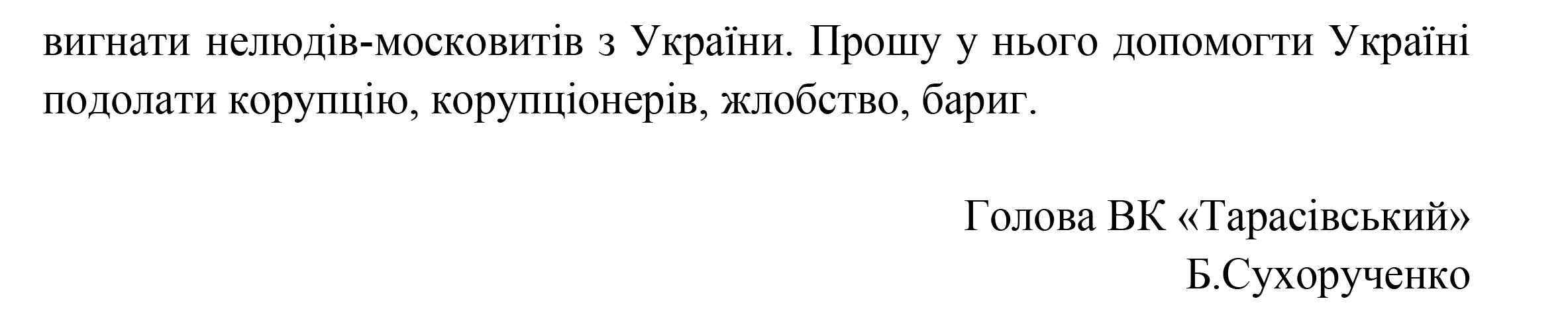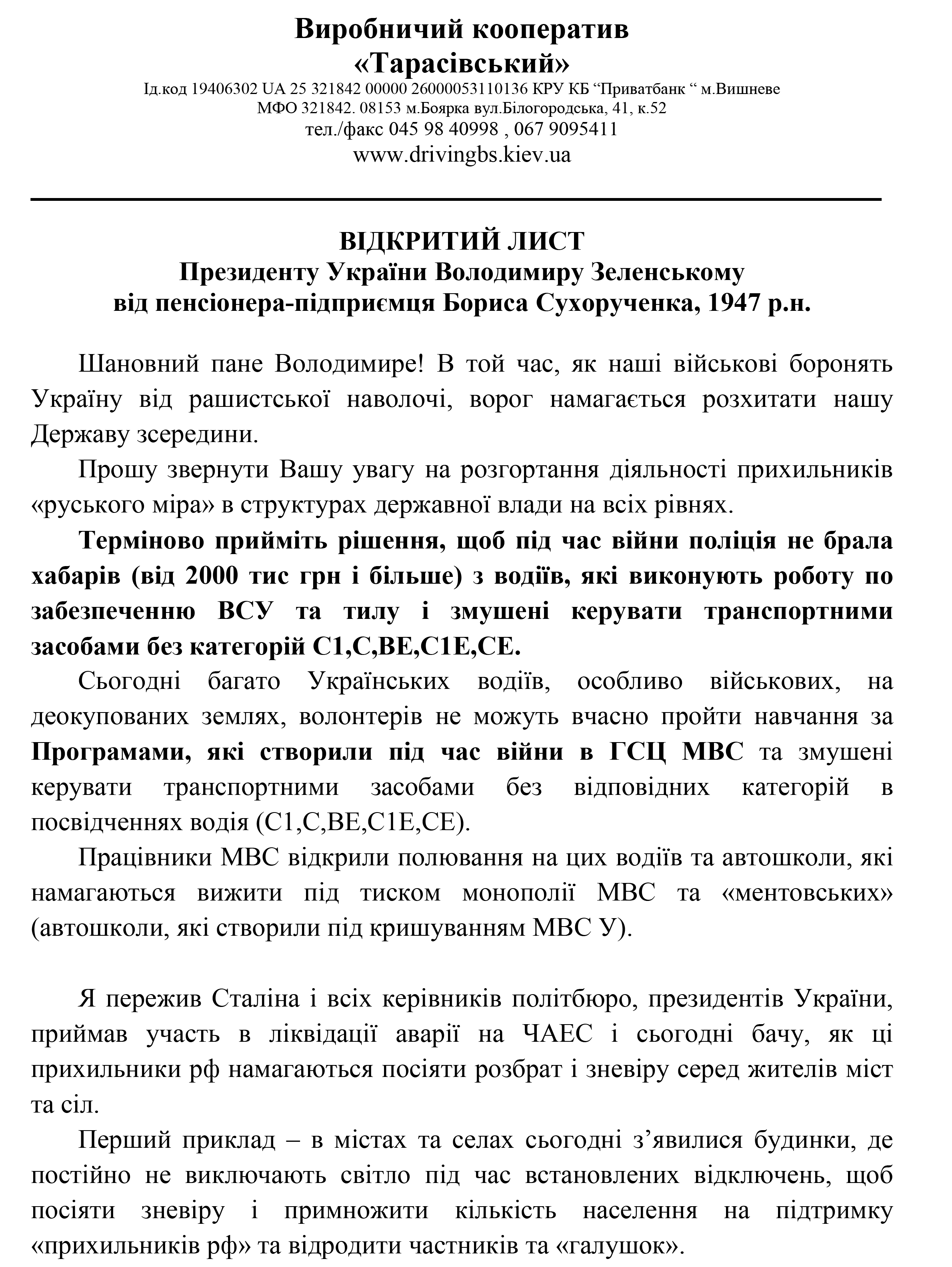 Відкритий лист від ВК "Тарасівський" Президенту України Володимиру Зеленському